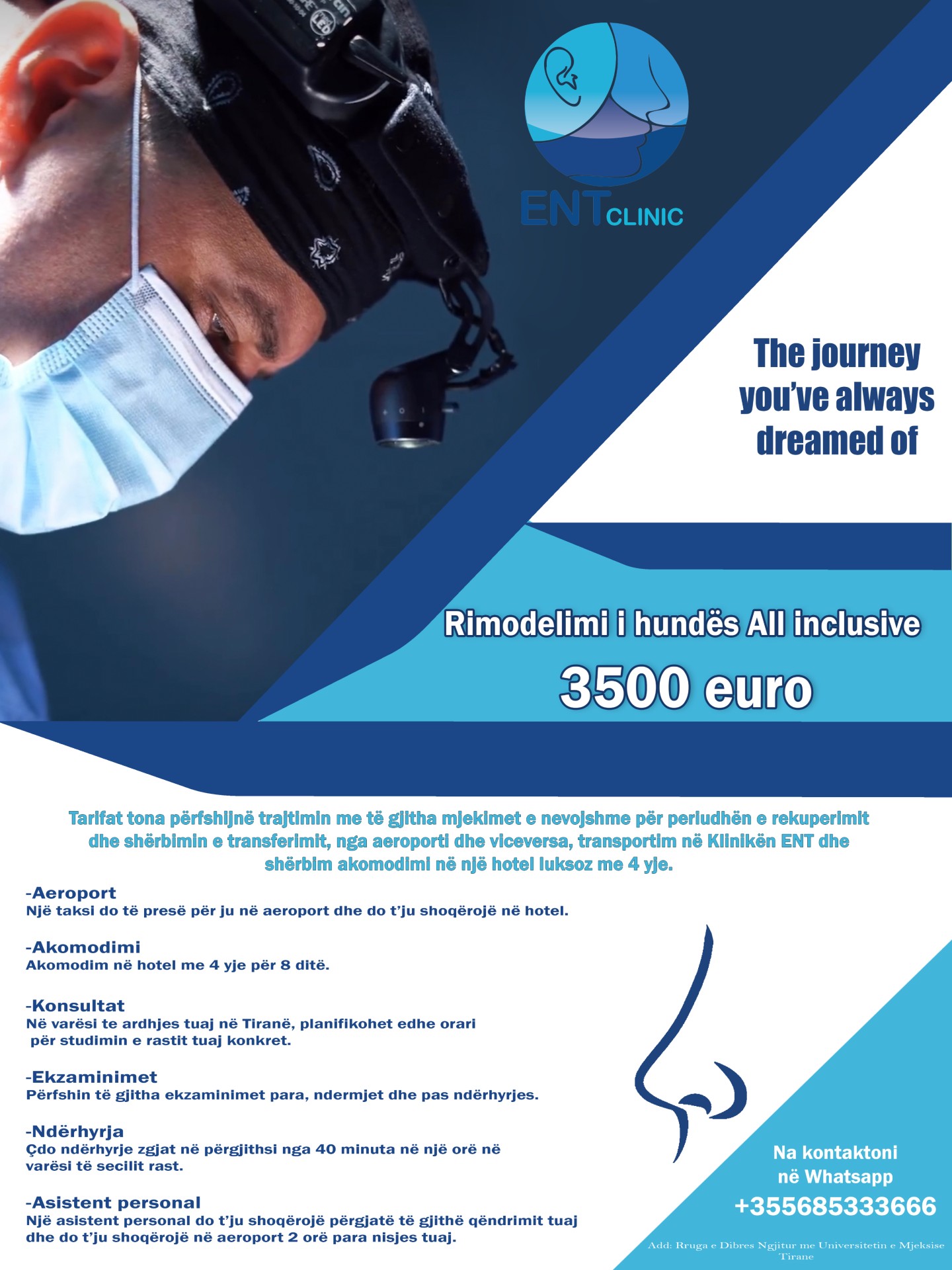 Tarifat tona përfshijnë trajtimin me të gjitha ilaçet dhe mjekimet e nevojshme për periudhën e rekuperimit dhe shërbimin e transferimit, nga aeroporti dhe viceversa, transportim në Klinikën ENT dhe shërbim akomodimi në një hotel luksoz me 4 yje.
